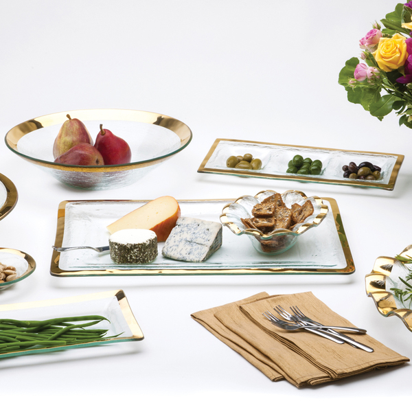 The generously large rectangular Annieglass Roman Antique Buffet Server is a stunning serving piece that belongs in every home. Simplistically elegant, with a slightly recessed clear glass base and 24k gold or genuine platinum hand-painted trim, use the Annieglass Roman Antique Buffet Server for everything from special holiday meals to everyday dinners, or leave out to admire year-round as a stunning centerpiece.