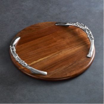 TEXTURED METAL HANDLES, RESEMBLING BOUND STRIPS OF LEATHER, ARE A NOTABLE FEATURE OF THE HEFTY SOHO GALENA LARGE ROUND CUTTING BOARD FROM THE CUTTING BOARD COLLECTION. SANDCAST OF DECORATIVE METAL, THE SILVER HANDLES OFFER A DRAMATIC CONTRAST TO THE RICHLY COLORED WOOD OF THIS SUBSTANTIAL CUTTING BOARD. IDEAL FOR SERVING YOUR FAVORITE CHEESES OR CHARCUTERIE. MAKES A WELCOMED GIFT.