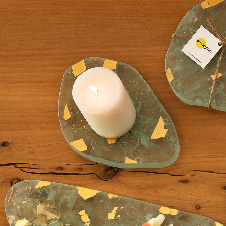 Elements Cloud Trivet is pear shaped and lovely with a candle in the center. Designed to protect any surface, tiny clear feet will prevent scratching. Made entirely from recycled Annieglass scrap glass to achieve zero waste goals in our studio. Accented with gold. Hand-wash only.