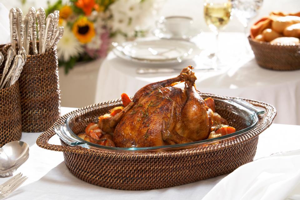 128.0 oz. Handmade by our talented artisans, this eco-friendly basket is made from tropical vines and is naturally heat resistant which can withstand the hot bakers coming straight from the oven. For basic cleaning, use a soft brush to keep the vines looking its best. A mild dish soap and water solution comes in handy for removing grease.